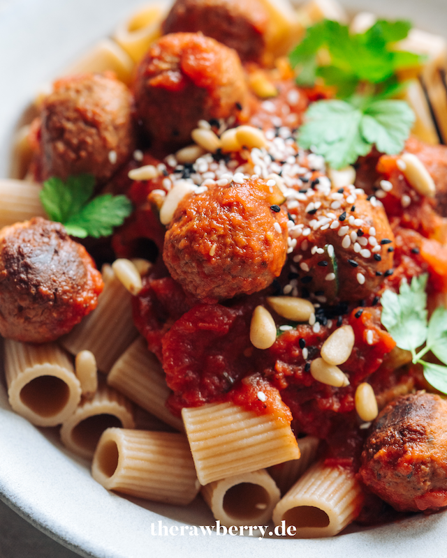 Glutenfreie Rezepte, Mittag- & Abendessen, Rezepte Vegane „Hackbällchen“ mit Pasta in würziger Tomatensoße in nur 20 Minuten