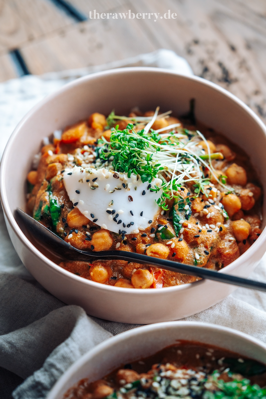 Die Tage werden schon wieder heller und ab und an liegt ein Anflug von Frühling in der Luft. Aber so richtig warm ist es auch noch nicht. Deshalb habe ich heute das perfekte wärmende Curry für dich. Gespickt mit Kichererbsen und extra Protein Pulver dürfte sich die Frage „wo bekommen Veganer eigentlich ihre Proteine her“ wie von selbst in Luft auflösen.