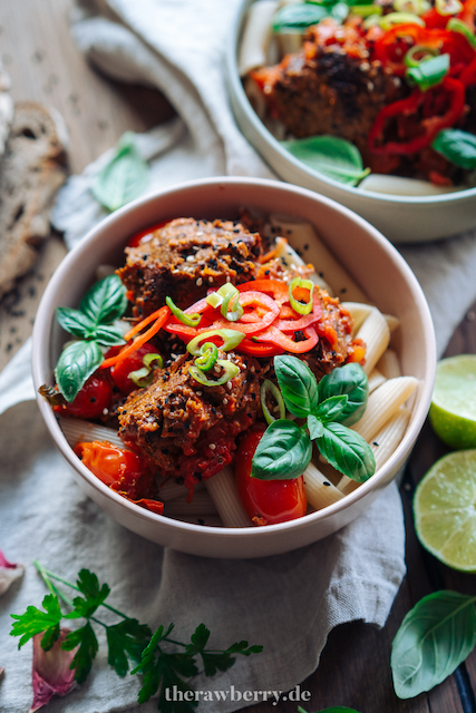 Nein! Ich kann euch beruhigen. Diese veganen Fleischbällchen schmecken super rauchig und würzig und sind auf der Basis schwarzer Bohnen. Die machen das ganze von der Textur so ein bisschen wie Fleischbällchen. Hinzu kommen allerlei Gewürze und Liquid Smoke – also flüssiger Rauch. Kennt ihr das? Habe das ewig nicht versucht und bin nun auf den Geschmack gekommen. Kann es euch nur wärmstens empfehlen. Denn es verleiht vor allem den veganen Gerichten ohne Fleisch einen sehr würzigen und rauchigen Geschmack. Ohne dabei zu sehr nach richtigem Fleisch zu schmecken. Das finde ich ja immer richtig wichtig. Denn nach 4,5 Jahren veganer Ernährung, möchte man nicht das richtige Fleisch schmecken. Aber so ein adäquater Ersatz ist schon richtig nice.