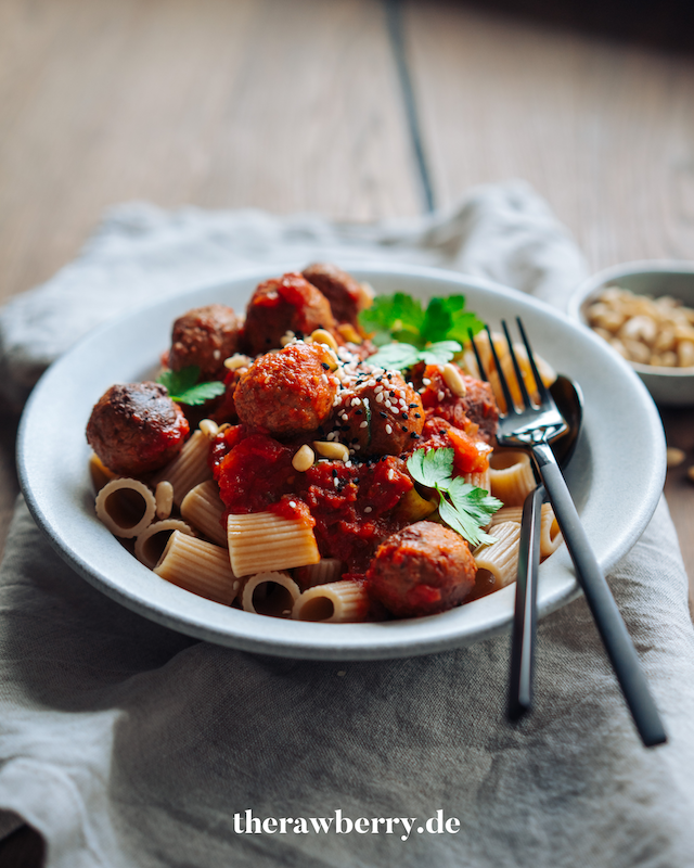 Die veganen Gemüsebällchen habe ich übrigens von endori. Einer richtig leckeren Marke, die auf die Basis von Erbsen setzt. Somit sind ihre Fleischersatzprodukte komplett Soja- und Palmfett frei. Schaut gerne mal vorbei (unbezahlte Werbung).