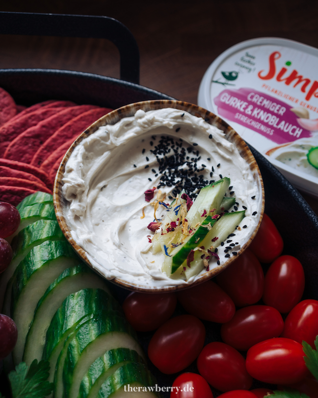 Wenn ich meine Platte so anschaue, dann ist sie ja stark einem griechischem Thema entsprungen. Mit den Oliven den Tomaten und vor allem durch den Streichgenuss „Cremiger – Gurke & Knoblauch“ (Typ Tzatziki). Das passt natürlich zu diesem Aufstrich am besten. Vor allem finde ich es richtig toll, dass es bereits solche Alternativen auf dem Markt gibt. Ich habe mich hier für die vegane Streichalternative von SimplyV „Typ Tzaziki“ entschieden. Mit ganz viel Gurke und Knoblauch – das hat perfekt zu meinem Thema gepasst. Schaut gerne einmal bei dem Produkt von SimplyV vorbei. Mehr Infos gibt es hier.
